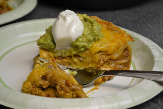 - Grab a round pan and lay your first tortilla down. If you are using the jumbo tortillas like me, it's not exactly going to fit. Tear the edges of the tortilla from the outside inward (about an inch deep) every three inches or so, and then press the tortilla down into the pan. This will allow the tortilla edges to overlap themselves and create a bit of a crust.